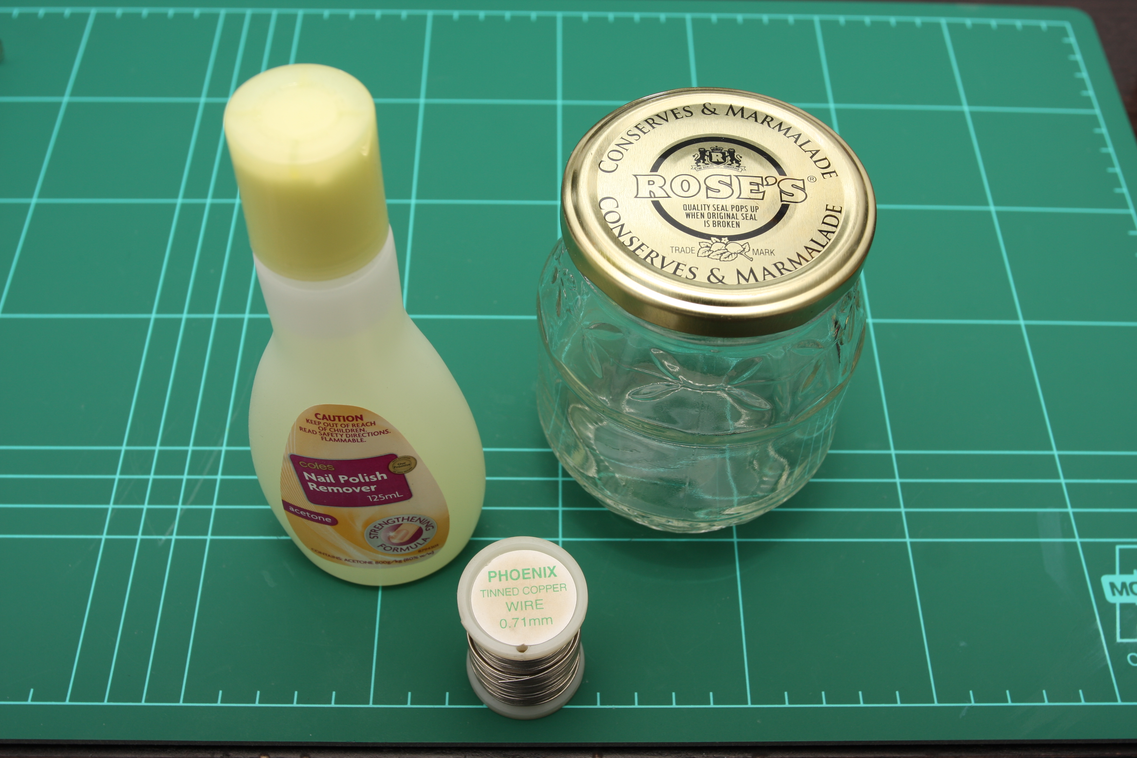 An unused jam jar with lid, nail polish remover (acetone) and some wire is all you need.