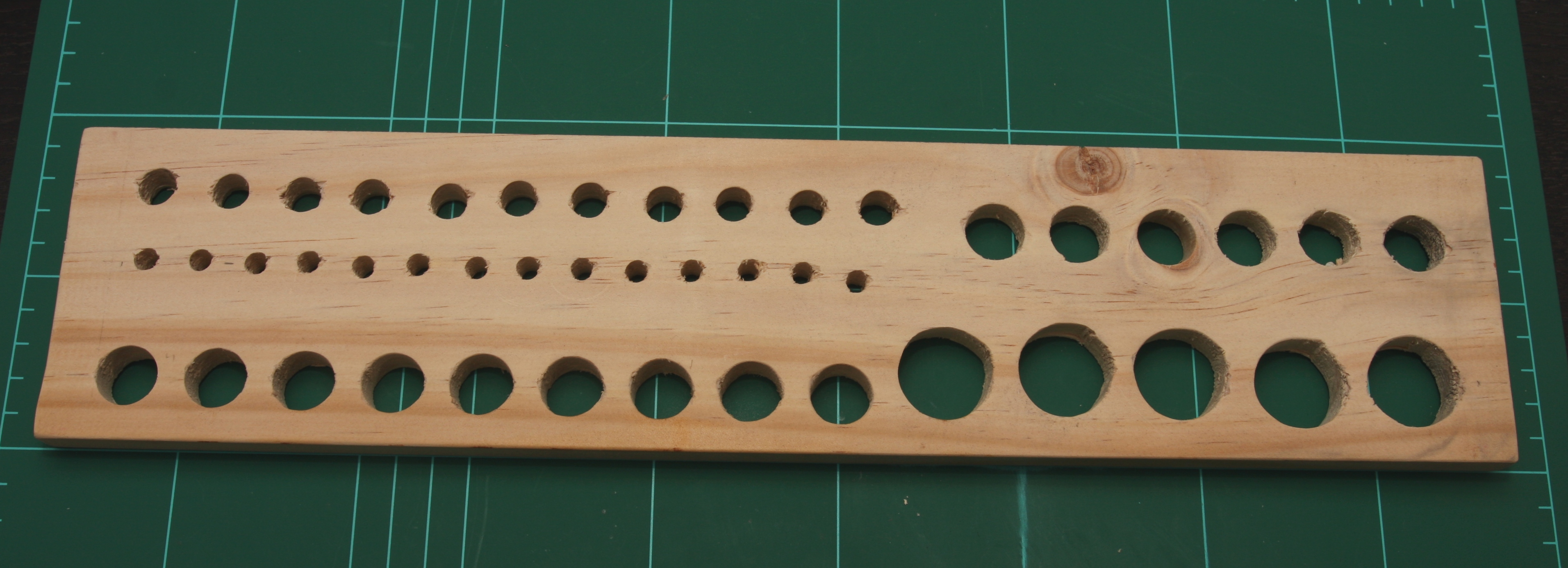 I’m not much of a woodworking person, I measured all the holes to be straight, but using a hand drill, the finish is a bit rough – lets call it character. Having all tools in the rack will hide the imperfections.