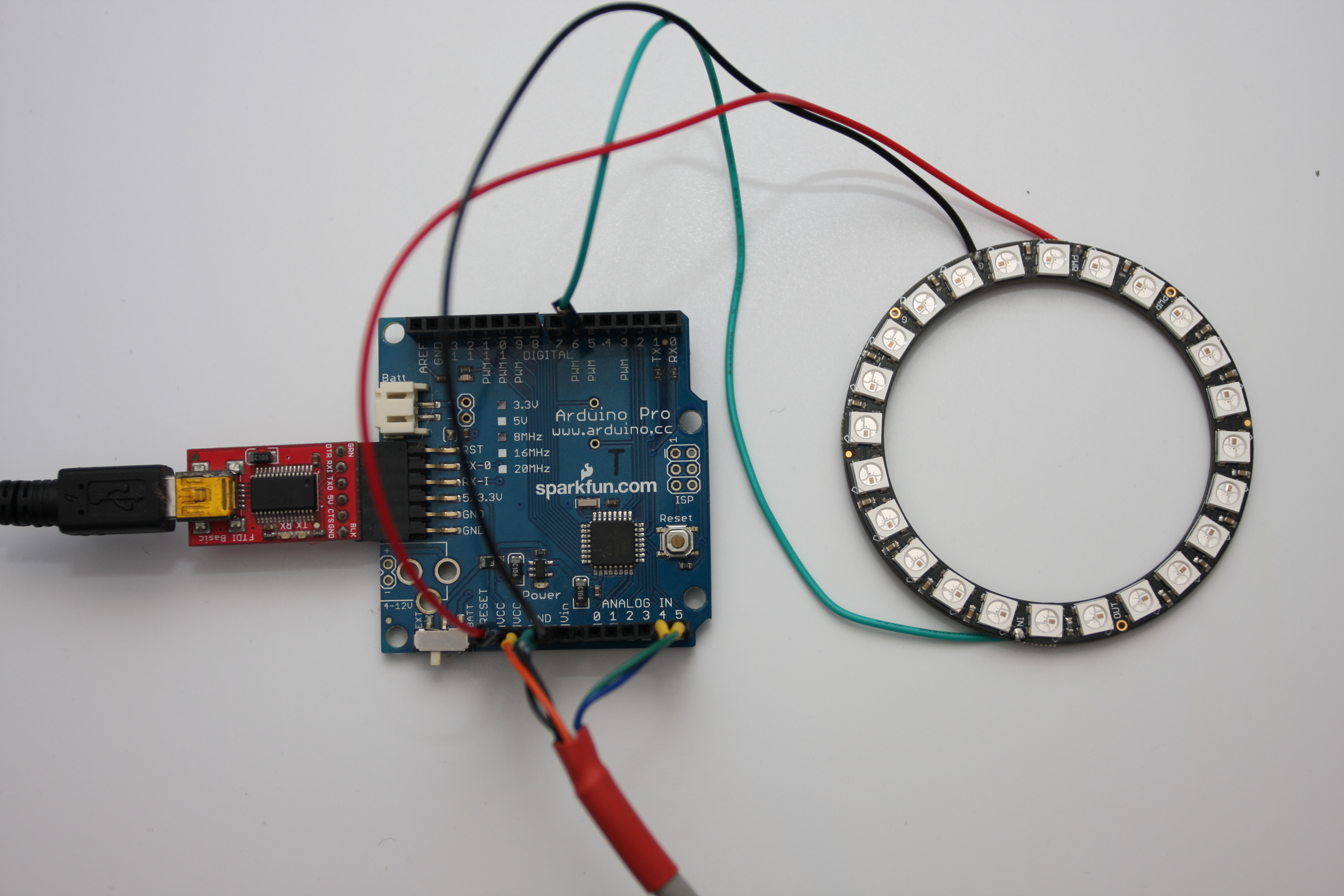 Power for the circuit will be provided by a FTDI Basic breakout connected to the programming port. The USB lead for the FTDI Basic will then be plugged into a USB wall adapter.