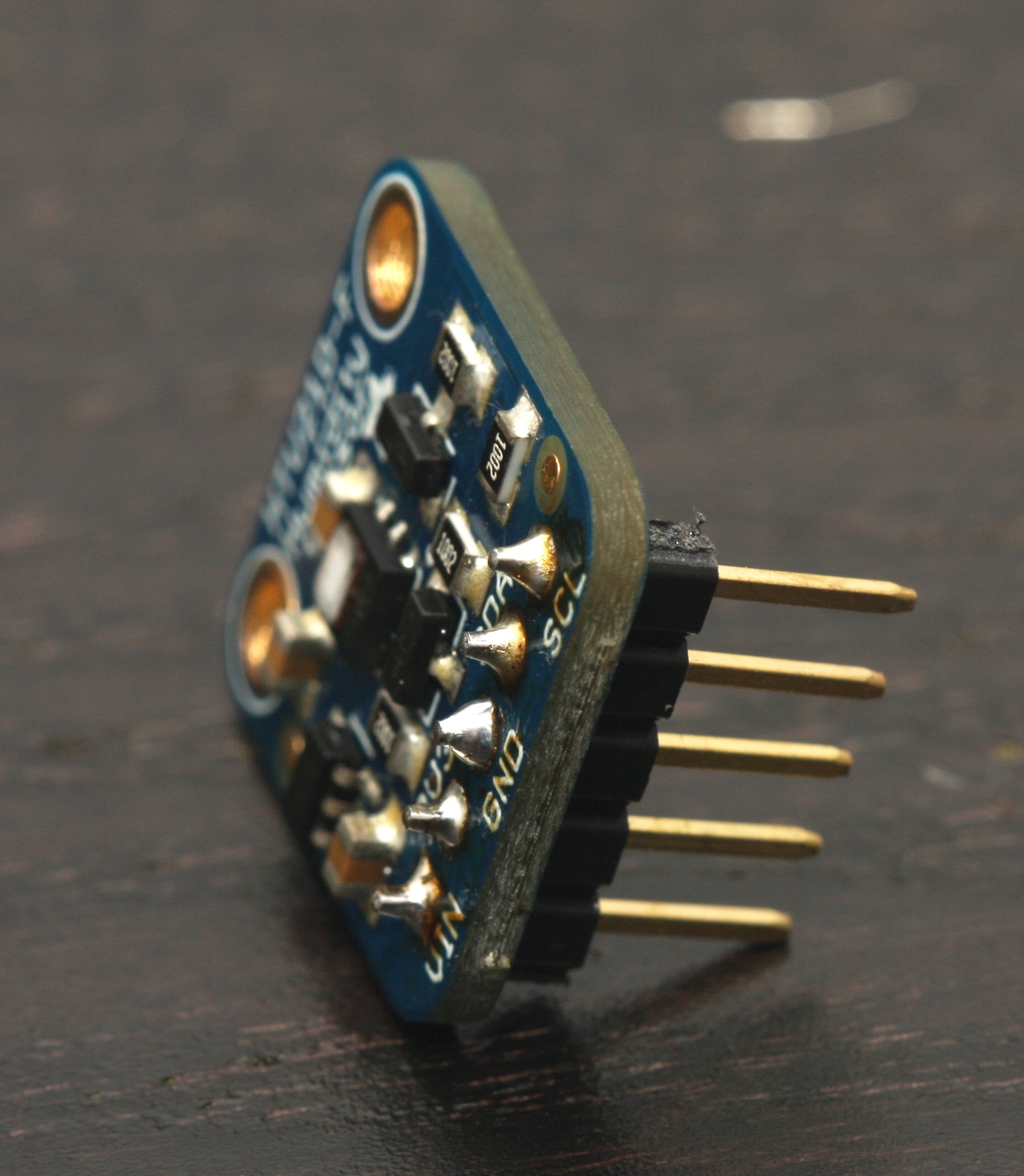 Solder 5 male pins to the HTU21D breakout board with the solder connection made on the component side of the breakout board.